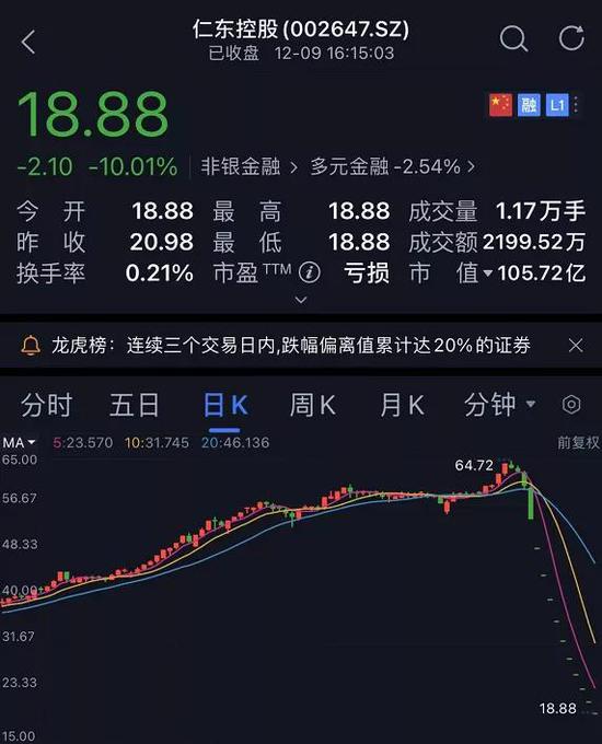 截至12月9日收盘,被股民称为“2020年最强绞肉机”的仁东控股再度跌停,股价报18.88元,至此该股已连续11个跌停,总市值已跌至105.72亿元。