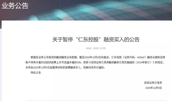 9日,深交所公告,根据各证券公司报送的融资融券业务数据,截至2020年12月8日收盘后,仁东控股(证券代码:002647)融资余额和信用账户持有市值均达到该股票上市可流通市值的25%。依照《深圳证券交易所融资融券交易实施细则(2019年修订)》的规定,本所自2020年12月9日起暂停该标的股票融资买入, 恢复时间另行通知。