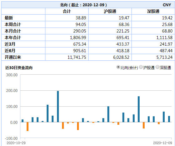 北向资金,今日净买入38.89亿元。其中,沪市净买入19.47亿元,深市净买入19.42亿元。