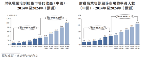 财税职业培训是财税职业培训机构为考生提供以考试为主导的培训服务。目前,由于市场对高级人才的需求不断增加以及在线教育的改革,推动了财税职业培训市场的发展。数据显示,参与专业培训的学员人数由2014年的2.2百万人增加至2019年的6.8百万人,复合年增长率约25.3%。于该期间的总收益由76亿元人民币增加至313亿元人民币,复合年增长率约32.7%。展望将来,该市场有望以约25.7%的复合年增长率呈上升趋势,并于2024年达到984亿元人民币。
