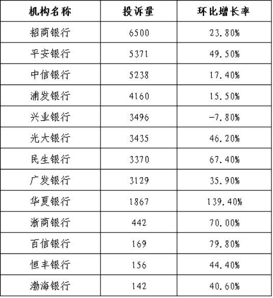 具体来看,《通报》表示,涉及国有大型商业银行27278件,环比增长16.1%,占投诉总量的32.1%;股份制商业银行37475件,环比增长30.6%,占投诉总量的44.0%;外资法人银行447件,环比增长19.8%,占投诉总量的0.5%;城市商业银行(含民营银行)8471件,环比增长46.0%,占投诉总量的10.0%;农村中小金融机构3418件,环比增长31.7%,占投诉总量的4.0%;其他银行业金融机构8008件,环比增长27.8%,占投诉总量的9.4%。