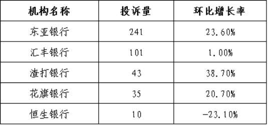 (三)东亚银行、汇丰银行和渣打银行的投诉量位列外资法人银行前三名。2020年第三季度,外资法人银行投诉量的中位数为3件。其中,投诉量较多的为:东亚银行241件,环比增长23.6%,占外资法人银行投诉总量的53.9%;汇丰银行101件,环比增长1.0%,占比22.6%;渣打银行43件,环比增长38.7%,占比9.6%;花旗银行35件,环比增长20.7%,占比7.8%;恒生银行10件,环比减少23.1%,占比2.2%。