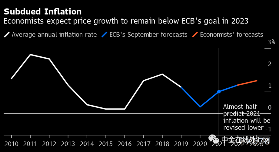 经济学家预测,由于第三季度强劲反弹,今年萎缩幅度不会像最初预期的那么严重。到2023年,通胀率将升至平均1.5%的水平,仍远低于欧洲央行“低于但接近2%”的目标。