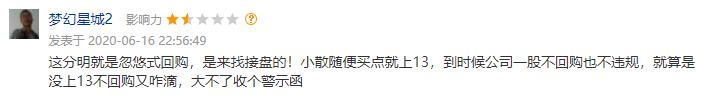 针对好想你的回复,网名为“梦幻星城2”的投资者如是指出,“这分明就是忽悠式回购,是来找接盘的!小散随便买点股价就上13元,到时候公司一股不回购也不违规,就算是没上13元不回购又咋滴,大不了收个警示函。”