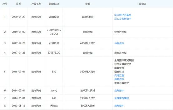 企查查数据显示,泡泡玛特至今为止一共完成了8轮融资,投资方有启赋资本、华强资本、黑蚁资本、金慧丰投资、正心谷创新资本和华兴新经济基金等。