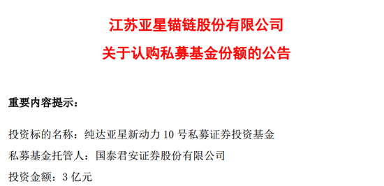 12月10日晚间,亚星锚链发布公告称,公司与上海纯达资产管理有限公司、国泰君安证券股份有限公司共同签署了《纯达亚星新动力10号私募证券投资基金私募基金合同》,使用自有资金人民币3亿元认购该基金份额。