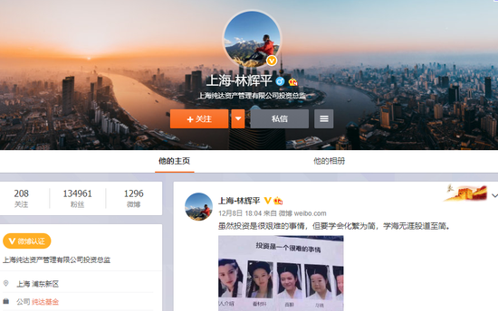 纯达资产投资总监林辉平则是武汉理工大学管理学硕士,据官网介绍,他拥有近20年证券投资经验,曾任职多家证券公司负责投资策略分析。林辉平还是微博大V,粉丝数超13万。