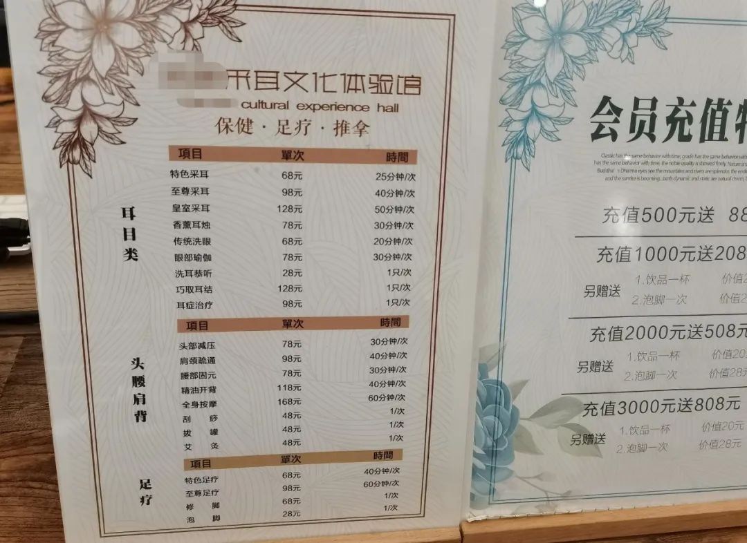 想点个最便宜的洗耳恭听 28元,小妹不给服务,说耳朵有问题才洗,没问题就不洗,只得点了特色采耳 68元/25分钟,有另一个客人点了全身按摩168元后上了二楼。