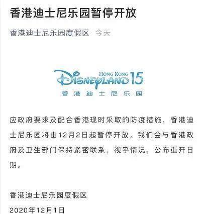 据微信公众号“香港迪士尼乐园度假区”消息,应政府要求及配合香港现时采取的防疫措施,香港迪士尼乐园将由12月2日起暂停开放。香港迪士尼乐园度假区表示,会与香港政府及卫生部门保持紧密联系,视乎情况,公布重开日期。