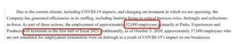 今年9月底,迪士尼曾表示,由于加州主题公园长期关闭,迪士尼将在其公园、体验和消费品部门裁员2.8万人。