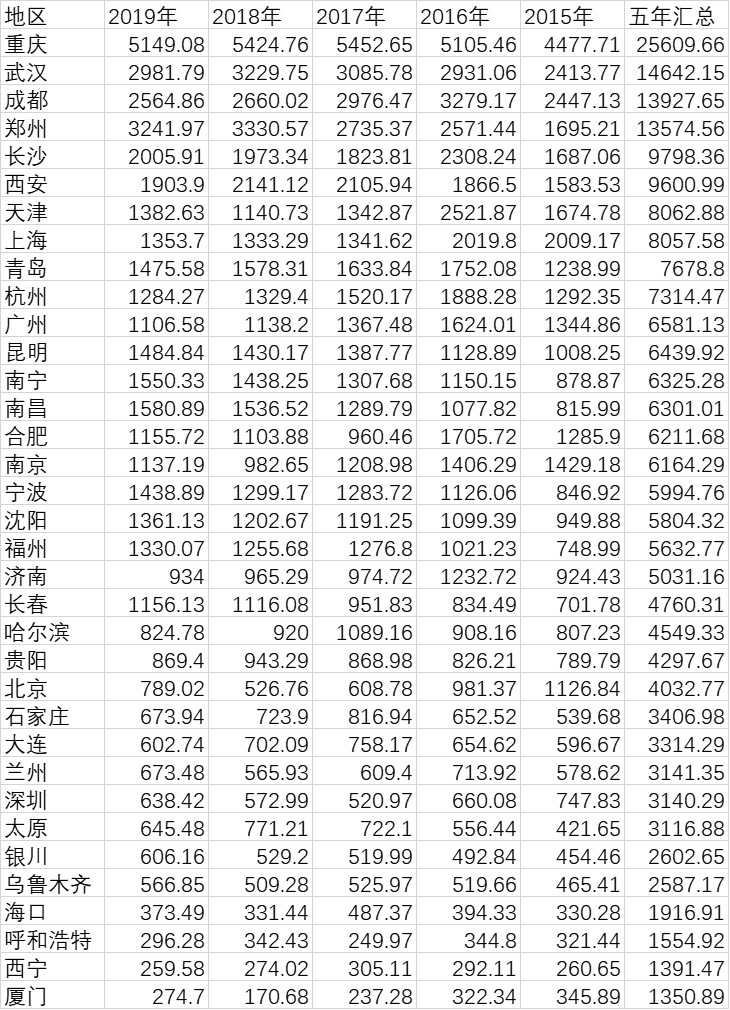 从近五年合计数据来看,前六名的城市全部位于中西部地区,分别是重庆、武汉、成都、郑州、长沙和西安。