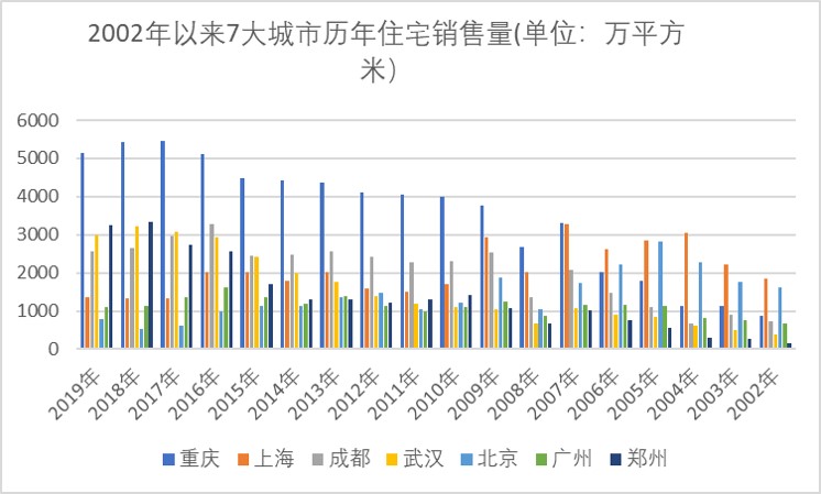 2002年以来7大城市历年住宅商品房销售面积(单位:万平方米)