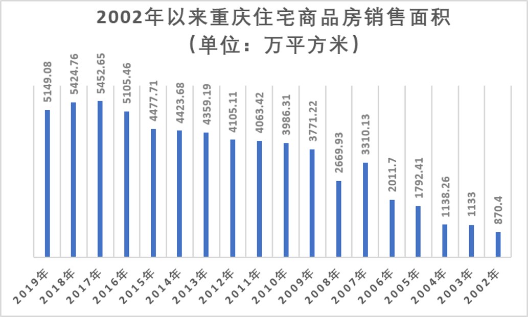 此后数年,基本延续了这个格局。其中,2005年,上海和北京住房商品房销售面积双双突破2800万平方米;到2007年,上海达到3279.17万平方米。这一年重庆达到了3310.13万平方米。自此之后,重庆一直稳居第一的位置,并且总体上呈现逐年走高的趋势。比如至2011年,重庆住宅商品房销售面积突破4000万平方米,到2016年超过了5000万平方米。