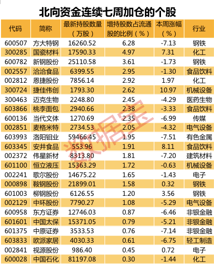 将时间拉长,24股被北向资金连续七周加仓。从持股比例变动情况来看,方大特钢获加仓幅度最大,较七周前增持股数占流通股的比例6.28%;其他连续加仓的还有国瓷材料、新钢股份、洽洽食品、恩捷股份等。