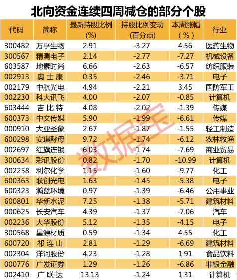 数据宝统计显示,北向资金连续四周卖出112股。分行业来看,计算机行业个股数量最多,有20只。