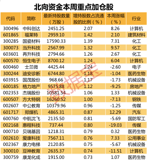 本周获北向资金加仓股共625只,以增持股占流通股比例来看,加仓幅度超0.5%的有38只。中科创达加仓比例最大,最新持股数为2451.25万股,增持股数量占流通股比例为2.07%;紧随其后是福莱特,加仓幅度为1.42%;其他加仓幅度靠前的还有国瓷材料、当升科技、再升科技、恒生电子、士兰微等。