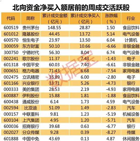 以净买卖金额统计,本周上榜的个股中,共有19只股为净买入,净买入金额最多的是贵州茅台,本周净买入金额为28.87亿元,其次是隆基股份、恒生电子,净买入金额分别为13.72亿元、13.5亿元。净卖出个股中,净卖出金额最多的是洋河股份,本周净卖出额为14.32亿元。