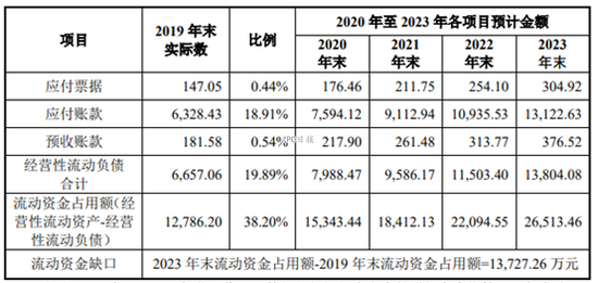 另外,肇民科技还列出了非常多的数据和计算表格,测算出公司2023年末流动资金缺口为1.37亿元,以此证明募集1亿元资金“补血”的合理性。
