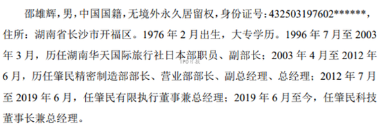 据了解,2003年4月至2012年6月,邵雄辉历任肇民精密塑胶制品(上海)有限公司(下称“肇民精密”)制造部部长、营业部部长、副总经理、总经理。2012年7月,邵雄辉成为了肇民科技董事长兼总经理,这距离肇民科技成立已经过去数月。
