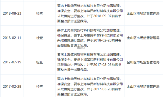 天眼查显示,上海市金山区市场监督管理局连续4次要求肇民科技采取措施进行整改确保安全,并将书面整改报告送至该局。