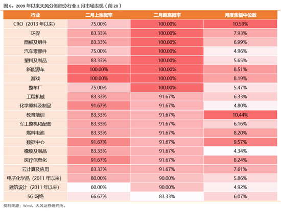 (3)在顺周期风格的趋势中,春季躁动的日历效应同样可能带来科技板块的超跌反弹,重点关注有边际变化且跌幅较大的行业信创。近15年以来,2月科技成长跑赢市场的概率极高,部分细分板块跑赢概率可以达到100%。通过回溯2005年以来2月的市场表现来看,科技成长板块在2月实现上涨的概率达到75%,跑赢沪深300的概率达到81.25%,具有显著的日历效应。其中,面板及组件、新能源汽车、游戏2月跑赢沪深300的概率达到100%。