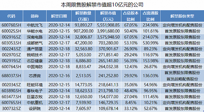 此外,本周限售股解禁数量超过1亿股的上市公司合计有10家,前三分别为华能水电、中航沈飞、成都燃气。同时,解禁市值超过10亿元的上市公司有14家。