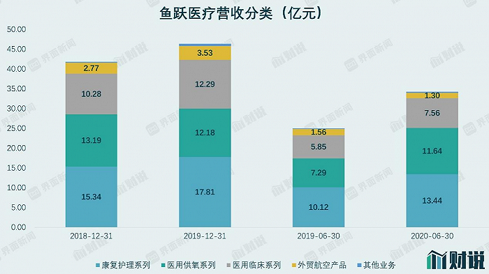 鱼跃医疗旗下业务较为分散。从营收结构看,主要分为康复护理、医用供氧、医用临床以及外贸航空四块业务。