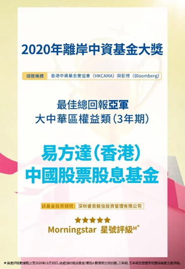 易方达(香港)中国股票股息基金灵活配置于港股、美国中概股以及沪深港通,该基金投资顾问为深圳睿泉毅信投资管理有限公司。截止2020年11月30日,该基金A类和I类港元分派份额的三年期、五年期及整体业绩均被晨星评为5星评级。凭借优异的长期表现,该基金目前为止还获得过《彭博商业周刊》2018年颁发的领先基金大奖,以及《中国证券报》2019年颁发的海外基金金牛奖。