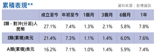 * 该基金I类 - 对冲(分派)人民币份额成立日期为2016年12月16日;I类(累积)美元份额成立日期为2016年12月29日;A类(累积)美元份额的成立日期为2018年1月9日。** 表现以资産淨值对资産淨值,股息(如有)再投资之总回报计算。