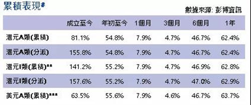 * 该基金港元A类(累积)份额的成立日期为2018年1月2日;港元A类(分派)份额成立日期为2015年11月16日;港元I类(分派)份额的成立日期为2015年10月23日。**港元I类(累积)份额原成立日期为2015年11月19日,并于2018年10月30日全部赎回,然后于2018年11月20日重新发行。表现数据自2018年11月20日起计算。***美元A类(累积)份额成立日期为2019年8月29日.#备注:表现以资産淨值对资産淨值,股息(如有)再投资之总回报计算。