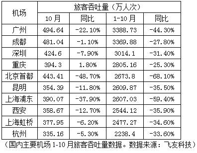 增速方面,重庆江北和成都双流则是仅有的两座同比降幅低于30%的机场,前10月的旅客吞吐量同比降幅为25.3%和27.8%。而北京首都机场的同比降幅仍达到68.1%。