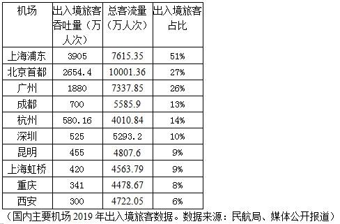 从2019年前十大机场的出入境旅客吞吐量占比观察,上海浦东机场的占比最高,达到51%,北京首都达到27%。