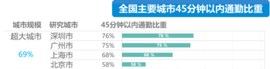 北上广深四座城市,平均只有69%的人能够在45分钟内上班。来源:《全国主要城市通勤时耗监测报告》