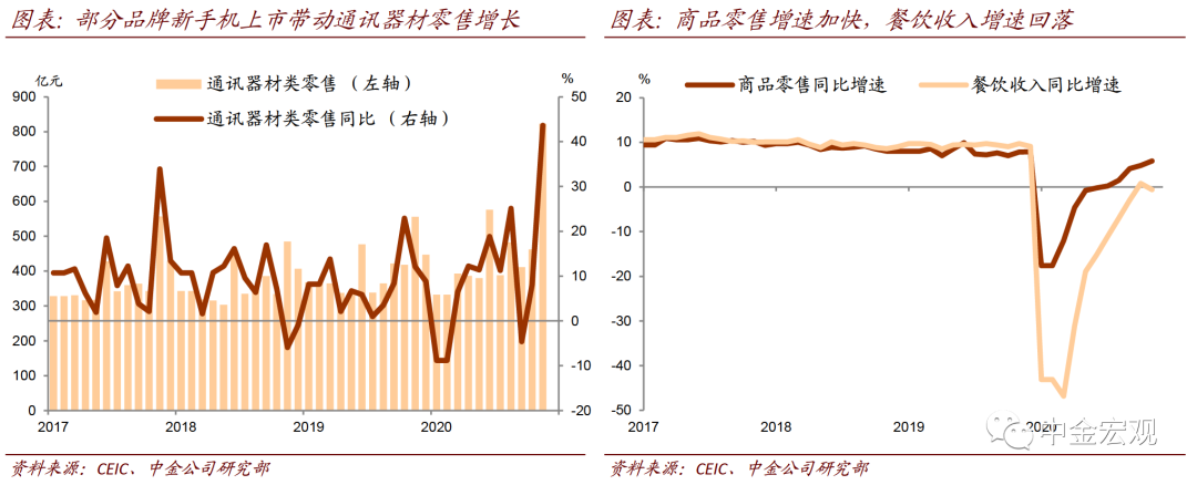 零售增速继续回升。11月社会消费品零售总额同比增长5%,和市场预期一致。部分品牌新型号手机上市带动通讯器材类零售同比大幅增长43.6%。“双十一”促销带动下,化妆品、金银首饰、饮料、家电等商品零售增速加快,但餐饮收入略有放缓。