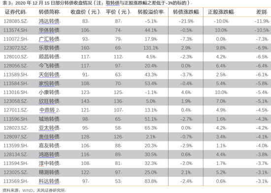 鸿达兴业、广汇汽车相关事件对市场情绪产生较大影响,部分转债回调幅度较大,比如华体、天创、奥佳转债等等,转债与正股涨跌幅之差低于-3%的标的共19只,其中仅5只转债平价超过100元,相关转债往往具有较高转股溢价率,机构选择持有时一方面或基于自身对于转债未来基本面的判断,另一方面也基于相关转债债底所给予的保护。我们认为此次信用事件冲击对转债市场或有以下启示: