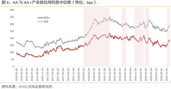 除了突发信用事件在特定时点下对转债市场造成冲击以外,在多段产业债信用利差上升的时间段内,低评级转债并没有出现相对于其他评级转债较差的表现。此处取2018年以来AA级产业链信用利差中位数快速上升的5个时间段来简单观察各评级转债均值的涨幅(此处仅为简要划分,并未详细结合信用冲击事件与流动性因素进行深入划分),从下表可以看到,多数时间段里A+转债均取得优于其他评级转债的表现,尤其在2020年。