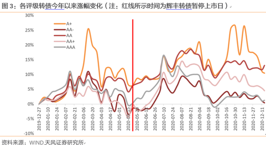 以辉丰转债暂停上市为例,在2018年年中关于辉丰“违约”预期提升后,转债市场估值并未出现显著收缩,但正是暂停之后,转债市场估值才出现快速反应。然而从5月底之后A+以及AA-等中低评级转债均值依然有较好的涨幅,在10月到11月之间,A+评级转债均值涨幅显著优于其他评级转债,但在11月中旬后,A+转债均值出现了加速调整,这也与自身正股估值调整有直接关联。