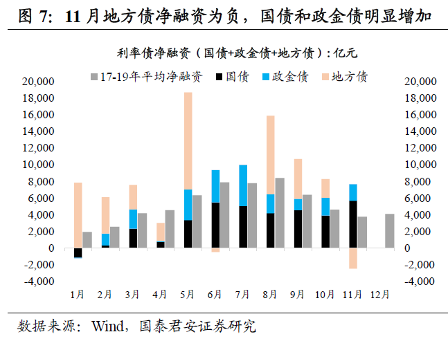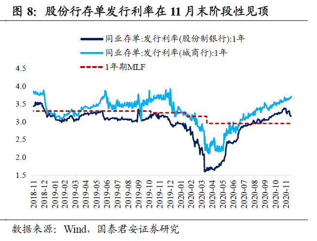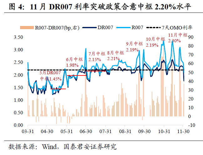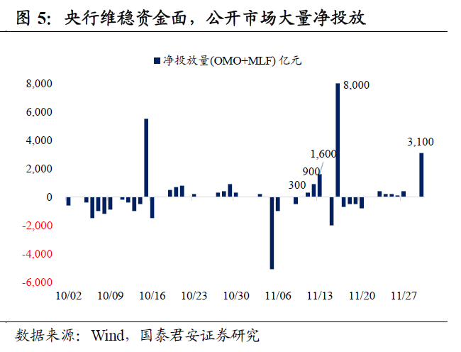 接下来,11月25日交易所GC007天量资金投放,规模超过节后2月3日的成交量,也超过2019年5月包商事件的成交量,同时央行也打破2020年以来的规律,在11月30日意外投放2000亿MLF,结合OMO操作,当日实现净投放3100亿。从时间点来看,无论是交易所天量资金,还是超常规MLF投放,均发生在信用风险缓和之后,因此更像是央行主动呵护资金面,短期释放的信号相对鸽派。