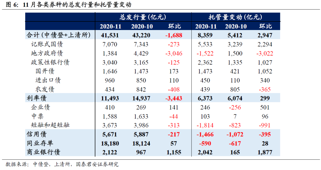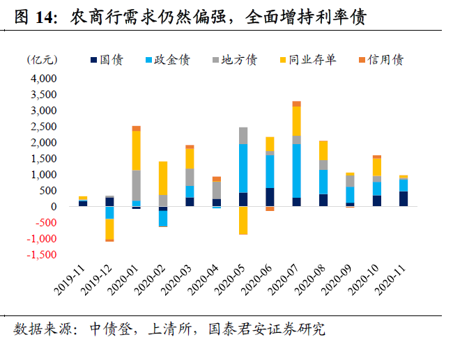 大行对利率债情绪回暖,为国债和政金债最大增持主力,减持信用债和存单。11月全国性商业银行总托管量增加1569亿,较10月环比多增116亿。主要增持国债2031亿(环比增加1352亿),增持政金债1041亿(环比增加388亿),减持地方债1848亿(环比减少3156亿),同时减持存单587亿(环比增加623亿)。另外,连续三个月减持信用债,减持640亿(环比减少389亿),其中减持超短融351亿、中票266亿和短融62亿,增持企业债39亿。