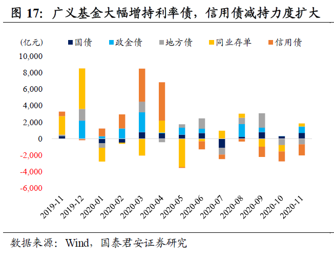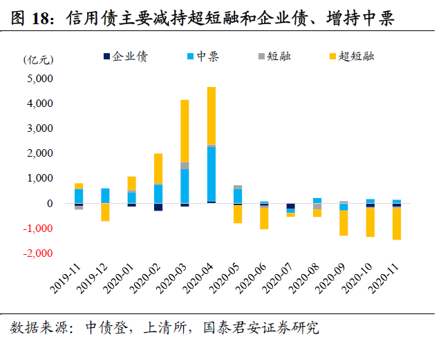 广义基金积极布局利率债,信用债减持力度扩大。广义基金总托管量增加1488亿,较10月环比增加3845亿。11月广义基金主要增持利率债788亿(环比增加1256亿),其中增持政金债786亿和国债695亿,减持地方债692亿。另外,在连续两个月减持存单后开始增持376亿,同时连续第七个月减持信用债,减持1329亿(环比多减144亿),为年内最大减持,其中减持超短融1259亿和企业债130亿、增持中票135亿。