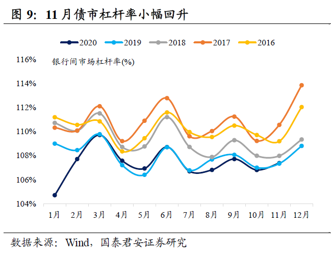 债市杠杆率小幅回升,银行杠杆回落,非银杠杆抬升。以“中债登托管量/(中债登托管量-待购回债券净余额)”衡量的11月债市杠杆率为107.4%,同比持平,环比上升0.6个百分点。商业银行杠杆率为96.8%,环比下降1.6个百分点;保险杠杆率为106.1%,环比上升2.4个百分点;券商和广义基金杠杆率分别为226.2%和113.4%,环比上升6.0和4.7个百分点。