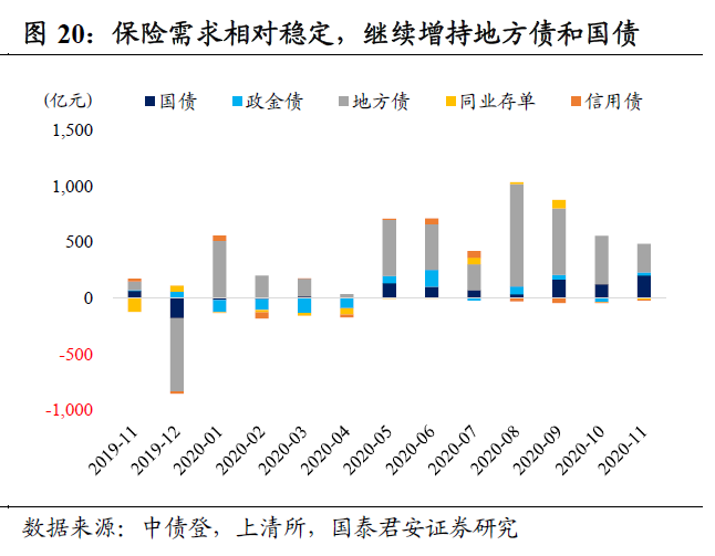6)券商谨慎情绪加剧,保险需求相对稳定。券商增持国债并全面减持其他券种,而保险继续增持地方债和国债。