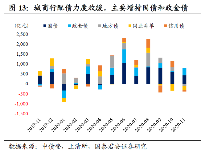 城商行配债力度放缓,主要增持国债和政金债。城商行总托管量增加562亿,较10月环比少增396亿。主要增持国债437亿(环比减少171亿)和政金债369亿(环比增加322亿),减持地方债116亿,同时减持存单187亿并连续三个月减持。另外,减持信用债80亿(环比减少391亿),其中减持超短融141亿、增持企业债55亿。