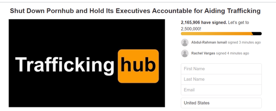 但从过往报道看,Pornhub上述问题由来已久,尽管Pornhub团队曾多次宣布做出整改,但有关问题却一直有增无减。因此,请愿要求彻底关闭Pornhub的呼声也远较以往要更高。数据显示,已有216万网民参与了“关闭Pornhub”的请愿活动。