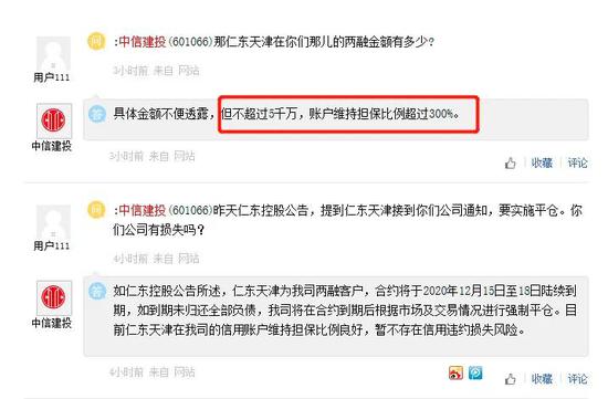 中信建投回复称:“如仁东控股公告所述,仁东天津为我司两融客户,合约将于2020年12月15日至18日陆续到期,如到期未归还全部负债,我司将在合约到期后根据市场及交易情况进行强制平仓。目前仁东天津在我司的信用账户维持担保比例良好,暂不存在信用违约损失风险”。