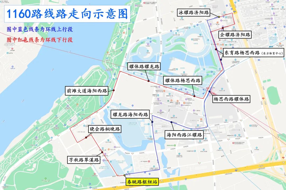 :春眺路枢纽站(起讫站)、耀龙路海阳西路、海阳西路江耀路、杨思西路耀体路、东育路杨思西路(上行)、泳耀路济阳路、东育路杨思西路(下行)、耀体路耀龙路、前滩大道海阳西路、晓会路桐晚路、芋秋路翠溪路、春眺路枢纽站(起讫站)。