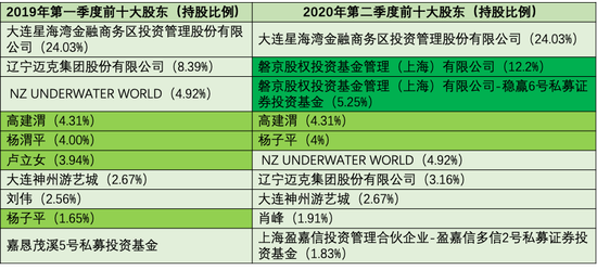 2019年第一季度,2020年第二季度前十大股东及持股比例(数据来源:大连圣亚公告,整理:崔浩)