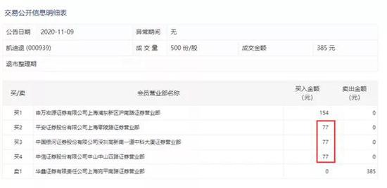 比如2020年11月9日,凯迪退全天仅成交5手,合计成交385元,其中几家营业部席位仅买入77元,就以跌停价格登上了龙虎榜。
