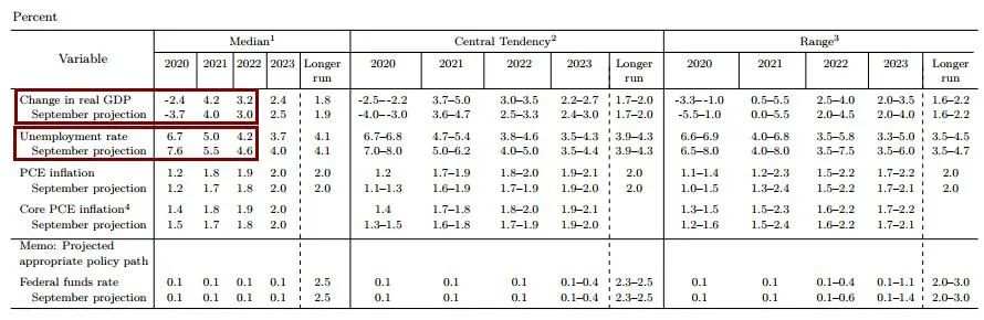 同时,美联储上调了最近三年的经济增长预期,将疫情期间推出的临时支持美元流动性工具期限延长六个月。美联储官员预计的中位值为:2020年美国GDP下降2.4%,上次9月公布的预期降幅为3.7%;2021年预期增速从4.0%升至4.2%,2022年增长预期从3.0%升至3.2%;2023年预期增速从2.5%降至2.4%,2023年以后更长期内增速预期从1.9%降至1.8%。