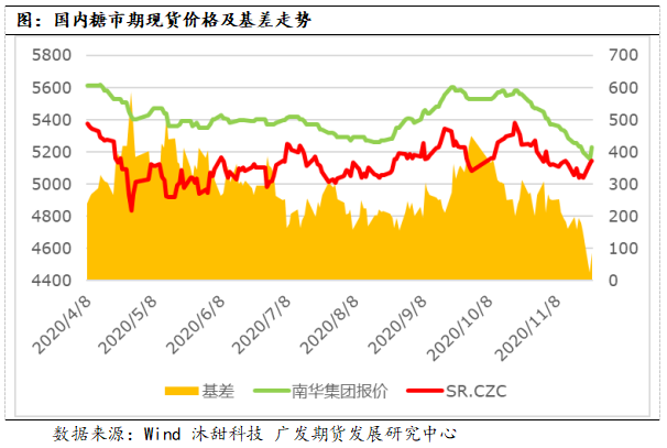 当前时点属于南方糖开榨高峰期,新糖逐渐上市,国产糖数量数据增加;此外,内外价差为正值,进口存在利润,11-12月份依旧有食糖进口动力,进口量预计不低,叠加当前加工糖厂库存持续增加,四季度的进口加工糖供应量较大。当前市场压力较大,基差虽然不高但是做多基差的动力不强,国内糖价预计延续偏弱走势。随着12月下旬春节备货期的到来,在需求增加的提振下,国内糖价有望迎来一波反弹上涨。